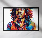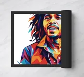 Questo ritratto di Bob Marley in stile WPAP cattura il suo look iconico utilizzando angoli audaci e colori vivaci. La sua espressione rilassata e i suoi caratteristici dreadlocks sono resi con contrasti netti, dando un senso di movimento e di vita. Lo sfondo si ispira a motivi astratti di ispirazione reggae, rendendo il disegno vibrante e fresco. Il disegno unisce perfettamente lo status leggendario di Marley con uno stile artistico contemporaneo.