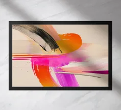 Pennellate audaci di giallo vibrante, corallo e bianco cremoso creano una composizione astratta. I colori sembrano mescolarsi e stratificarsi energicamente, dando un senso di movimento dinamico e di contrasto.