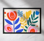 Una vivace serie di fiori e foglie stilizzati si staglia su un audace sfondo rosso. Vari fiori nei toni del rosa, del blu, del giallo e del rosso sono intervallati da fogliame verde e blu, creando una composizione vivace e allegra.