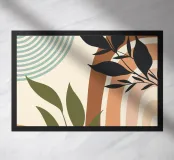 Foglie stilizzate in nero e verde si stagliano su uno sfondo di strisce curve e fluide in morbide tonalità di terra. Il disegno combina elementi botanici con forme geometriche astratte per un look moderno.