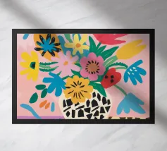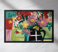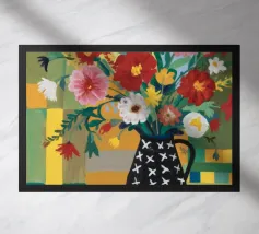 Un vivace bouquet di fiori colorati è disposto in un vaso decorato con un patchwork di motivi diversi, creando una natura morta floreale unica e artistica.