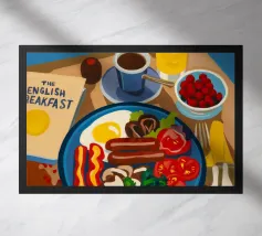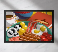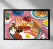 A top-down view of a hearty breakfast spread including eggs, bacon, sausages, pancakes, and coffee, depicted in a bright and appetizing illustrative style.