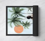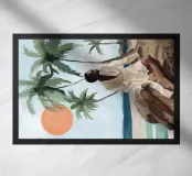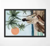 Grazioso dipinto digitale di una donna sicura di sé in una fluente vestaglia bianca seduta su una spiaggia rocciosa con palme e un vibrante sole arancione. Questa elegante e serena scena costiera evoca lusso, calma e vibrazioni tropicali. Perfetto per gli amanti della moda, dell'arte moderna e dell'arredamento tropicale. Aggiunge raffinatezza e calore a soggiorni, camere da letto e uffici. Regalo ideale per i collezionisti d'arte e gli appassionati di ritratti contemporanei ispirati alla spiaggia.