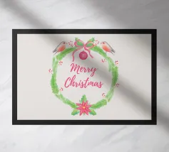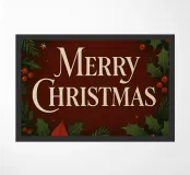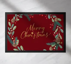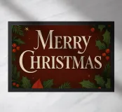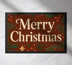 Una calda ed elegante illustrazione natalizia con vibranti stelle di Natale, rami di pino, bacche e stelle dorate che circondano un messaggio senza tempo di "Buon Natale". I ricchi rossi e i verdi intensi creano un'atmosfera classica e festosa, perfetta per interni accoglienti, angoli regalo e decorazioni stagionali.