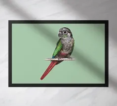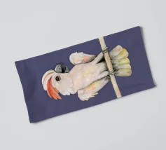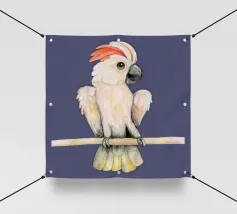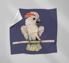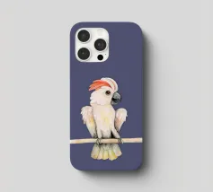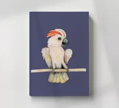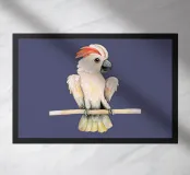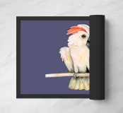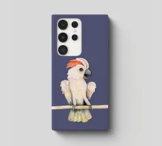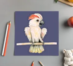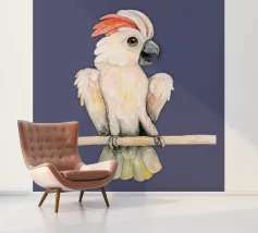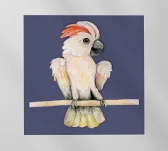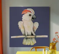 Disegno ad acquerello di un simpaticissimo cacatua dal ciuffo salmone o cacatua delle Molucche. Sta urlando in preda all'agitazione.
