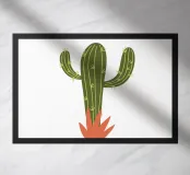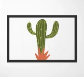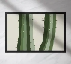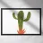 Un cactus stilizzato con tre braccia e dettagli a spillo si erge in alto. Alla base, una pianta arancione aggiunge un tocco di colore a contrasto.