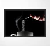 tazza caffè cucchiaio vapore zucchero porcellana bianca piattino bevanda calda sfondo nero ceramica cucchiaio in mano versare granelli di zucchero recipiente per bere routine mattutina caffeina cerimonia utensili da cucina aroma preparazione delle bevande