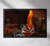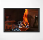 caffè tazza di vetro fuoco fiamma bastoncini di cannella chicchi di caffè blocco di legno luce calda scintille riflessi macinino vintage sfondo scuro bevanda fumo calore galleggiante azione caffè in infusione cucina tavolo in legno
