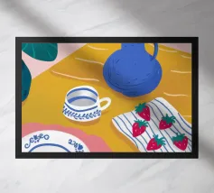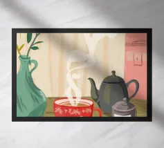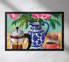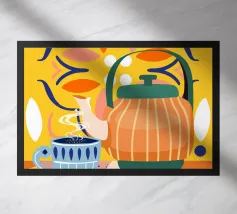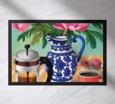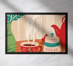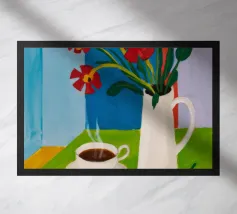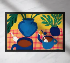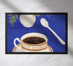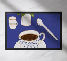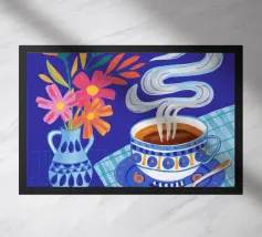 Illustrazione stravagante di una tazza di caffè fumante in una tazza a scacchi blu e bianchi, con fiori stilizzati che fluttuano sopra di essa, su uno sfondo blu scuro e ondulato.