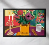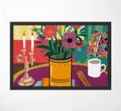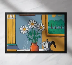 Una vivace natura morta con una tazza di caffè e un bel mazzo di fiori su un tavolo rotondo a fantasia. I colori ricchi e la composizione vivace creano una scena mattutina o pomeridiana allegra ed energica.