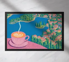 caffè espresso tazza piattino vapore costa acqua case edifici scogliera mare oceano riva piatto città costiera orizzonte all'aperto bevanda calda cultura italiana vista panoramica