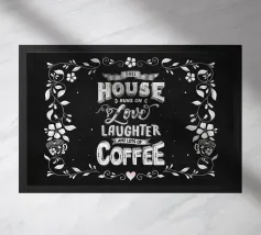 Questa casa funziona con l'amore, le risate e le tazze di caffè forte. Questa casa funziona con l'amore, le risate e le tazze di caffè forte. Design tipografico moderno.