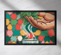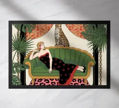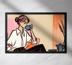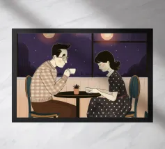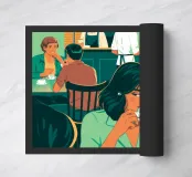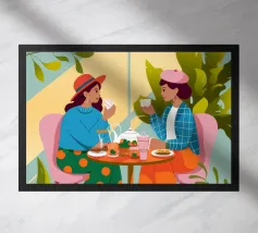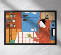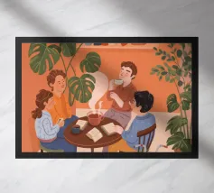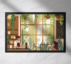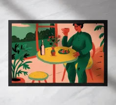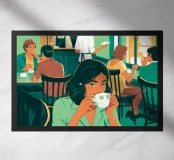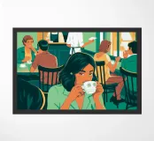 Questo dipinto raffigura una scena di caffè con persone sedute ai tavoli che leggono e conversano. Lo sfondo comprende un cameriere e una parete verde, creando un'atmosfera accogliente e intellettuale.