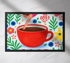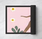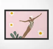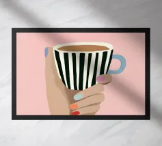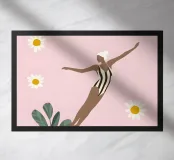 Una scena giocosa con un nuotatore in costume a righe bianche e nere che si tuffa in una tazza di caffè gigante color cipria. Il cielo rosa tenue, le allegre margherite e le forme solari degli agrumi aggiungono fresca energia mattutina. Le forme minimaliste e i colori pastello creano un'atmosfera moderna e stravagante che ricorda il primo sorso della giornata.