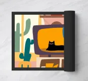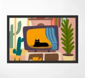 Questa immagine raffigura una stanza accogliente con un gatto nero sdraiato su un televisore. La stanza è piena di piante, una libreria e decorazioni colorate che creano un'atmosfera calda e invitante.