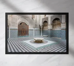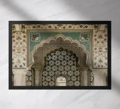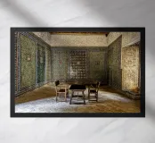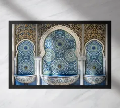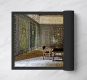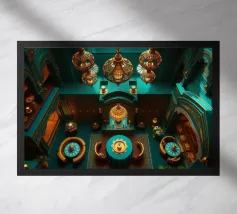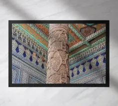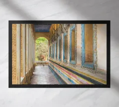 L'immagine mostra un interno storico della Casa de Pilatos di Siviglia, un palazzo del XVI secolo con influenze architettoniche mudéjar, gotiche e rinascimentali. Le pareti sono completamente ricoperte da piastrelle decorate con motivi geometrici e floreali nei toni del blu, del verde e del marrone. Queste piastrelle sono tipiche dell'arte mudéjar e riflettono la diversità culturale dell'Andalusia. Il soffitto è costituito da pannelli in legno dorato con complessi ornamenti e rilievi che documentano la maestria dell'epoca.