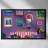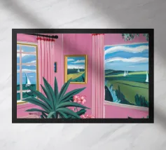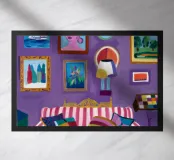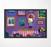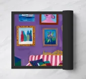 Un soggiorno vivace con un'audace parete viola, un divano a strisce rosa e una galleria d'arte colorata. L'eclettico mix di colori e arredi crea uno spazio divertente, energico e senza fronzoli.