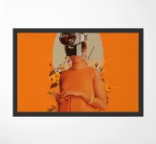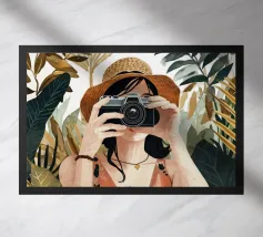 c'è una fotografia nella mia testa che contiene ogni ricordo di te. ~ una donna che indossa un abito arancione con macchina fotografica vintage come una testa vibrante sfondo arancione con elementi floreali retrò.