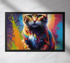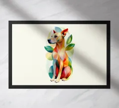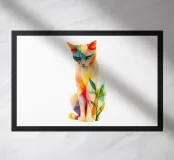 Una vivace illustrazione geometrica di un gatto seduto con forme sovrapposte dai colori dinamici, abbinata a elementi astratti a forma di foglia per un design moderno e creativo.