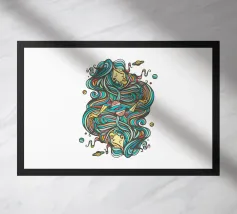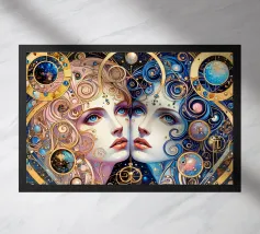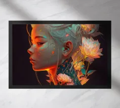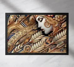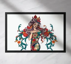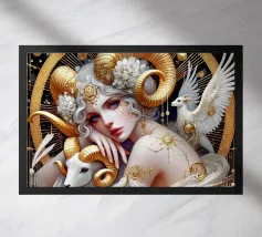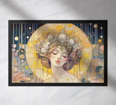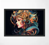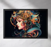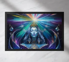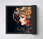 Uno squisito ritratto fantasy che unisce eleganza regale e simbolismo cosmico. La Sovrana Celeste raffigura una potente figura femminile adornata con un copricapo dorato e ornato da motivi lunari e celestiali. Nastri fluenti di turchese, oro e cremisi si intrecciano intorno a lei, creando un'aura radiosa di misticismo e forza. Una celebrazione della femminilità divina, dello stile art nouveau e dell'intricato artigianato digitale.