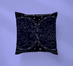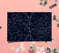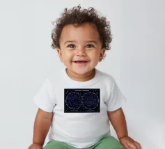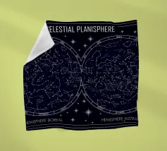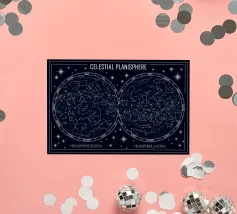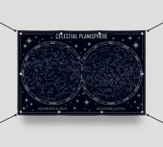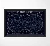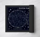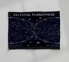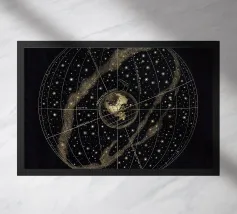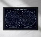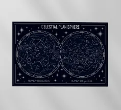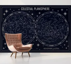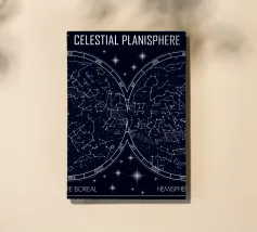 An elegant celestial planisphere illustrating the night sky of both hemispheres. Delicately drawn constellations, seasonal months, and star patterns create a timeless astronomical artwork. Perfect for modern interiors, science lovers, and minimalist spaces seeking a refined cosmic atmosphere with educational charm and visual balance.