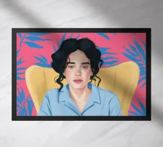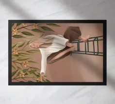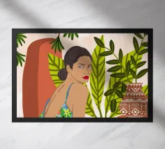Ritratto di una donna seduta su una sedia rossa, incorniciata da grandi e rigogliose foglie di monstera. La sua posa riflessiva e la sua espressione calma evocano un senso di introspezione e chiarezza. I toni morbidi e terrosi e gli elementi naturali fondono il minimalismo moderno con la bellezza botanica, rendendo quest'opera d'arte perfetta per gli interni contemporanei.