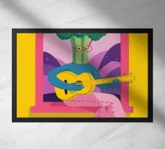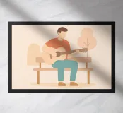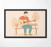 Design minimalista raffigurante un musicista che suona la chitarra su una panchina. Rappresentazione stilizzata e decorativa di un chitarrista. Bella idea regalo per tutti coloro che amano fare musica, cantare e comporre canzoni, suonare per strada o semplicemente ascoltare musica.