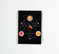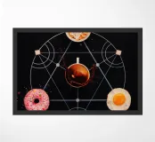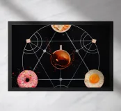 ciambella uovo a testa in giù ciotola di cereali schizzo di caffè motivo geometrico alimenti per la colazione spruzzi cereali schizzi di latte uovo fritto tazza di caffè composizione della colazione presentazione di cibo motivo circolare contrasto di colore guarnizioni zuccherate simmetria del cibo sfondo nero forma di pentagramma combinazione di dolce e salato