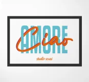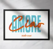 Una poesia d'amore visiva in tre colori e due lingue: La parola "AMORE" si staglia grande e azzurra sullo sfondo, come un silenzioso grido di desiderio. Davanti, "Ciao" cattura lo sguardo in un forte rosso arancio, con un affascinante effetto ombra che crea profondità e movimento. Sotto, quasi come una firma: "studio scusi" in un caldo giallo senape. Lo sfondo beige conferisce al motivo una calma mediterranea, come un tramonto in Liguria.
