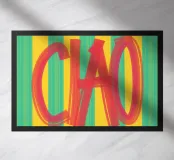 Un simpatico poster tipografico dal sapore italiano: la scritta "CIAO!" dipinta a mano in rosso vivace contrasta con lo sfondo a righe in giallo e turchese. Il mix di pennellate libere e colori retrò rende il disegno un perfetto richiamo visivo per cucine, corridoi o studi creativi. Un saluto allegro - forte, colorato e affascinante, mediterraneo.