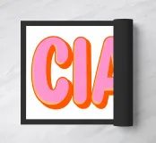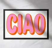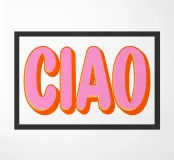 Questo vivace design presenta la parola "Ciao" in un audace carattere di ispirazione retrò con caratteri rosa acceso e un sorprendente contorno arancione.