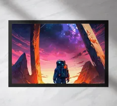 Si apre un paesaggio ipnotico, dove cime imponenti trafiggono un cielo pieno di sfere di luce. La scena è un tripudio di colori, con sfumature di arancio, rosa, blu e viola che si fondono senza soluzione di continuità. L'uso di linee spigolose e taglienti accostate a forme morbide e arrotondate crea una tensione visiva accattivante. Un fiume tranquillo si snoda nella valle, riflettendo i colori vibranti che la sovrastano. Quest'opera invita lo spettatore a esplorare un mondo in cui colore e forma danzano in perfetta armonia.