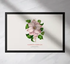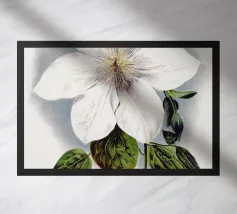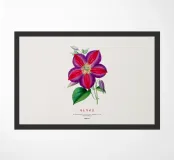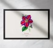 Un'impressionante opera botanica di una clematide in piena fioritura: petali viola vellutati con vivaci venature cremisi si irradiano da un centro giallo brillante.