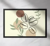 I chicchi di caffè sono disegnati in nero, circondati da forme astratte e foglie verdi su uno sfondo chiaro. Il disegno bilancia gli elementi naturali con la semplicità.