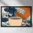 Un'illustrazione stilizzata raffigura una tazza e un piattino da caffè bianchi appoggiati su una grande onda che si infrange. L'onda è resa nel classico stile giapponese della stampa su blocco di legno, con sfumature di blu, bianco e arancione. Lo sfondo è in tinta unita arancione, creando un contrasto vibrante con il blu e il bianco dell'onda.