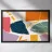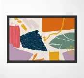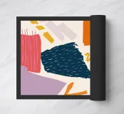 Un collage astratto di forme frantumate e sovrapposte in una vibrante tavolozza di arancione, blu e rosa crea una composizione dinamica, energica e moderna.