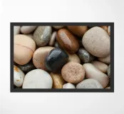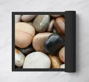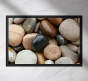 Una varietà di pietre di fiume lisce mette in mostra una serie di colori e dimensioni, appoggiate l'una all'altra. La luce si riflette sulle loro superfici, creando uno spettacolo sereno e naturale.