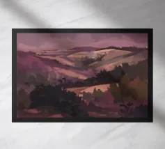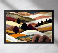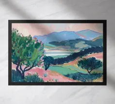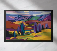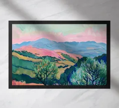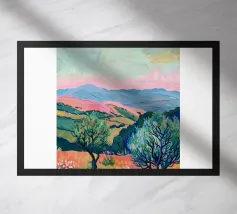 Morbide colline ondulate mostrano ricche sfumature di rosa, arancione e blu, mentre un cielo vibrante pieno di soffici nuvole esalta l'atmosfera tranquilla. Piccoli alberi punteggiano il paesaggio.