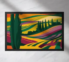 Un paesaggio panoramico delle dolci colline toscane, con strade tortuose, cipressi e campi resi con una tavolozza di colori ricchi e caldi che cattura la bellezza della campagna italiana.