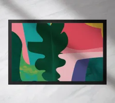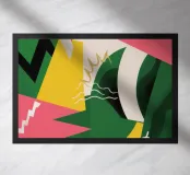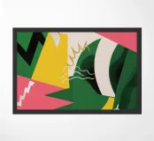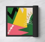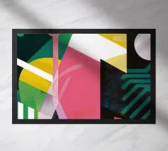 Un'energica opera d'arte astratta composta da frammenti di verde, giallo, rosa e nero che si scontrano tra loro. La composizione dinamica crea un senso di caos controllato e di energia moderna e tagliente.