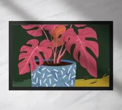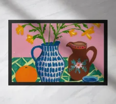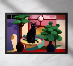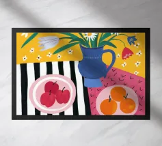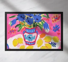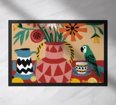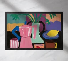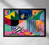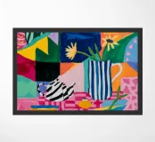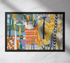 Un collage vibrante e caotico di motivi contrastanti, tra cui righe, pois e forme organiche. La gioiosa esplosione di colori e texture crea un'opera d'arte energica e piena di vita.
