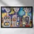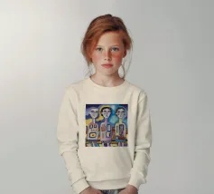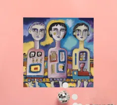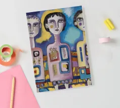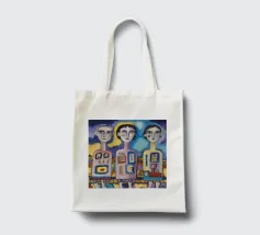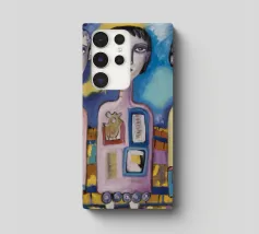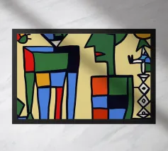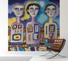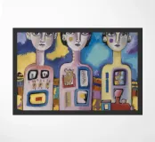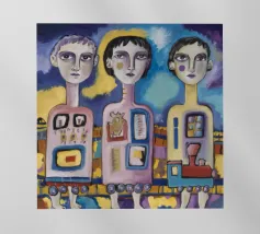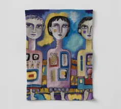 Questa opera d'arte presenta due figure che assomigliano a robot, con forme e motivi geometrici sui loro corpi. Lo sfondo è un mix di blu e giallo, con elementi astratti.