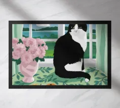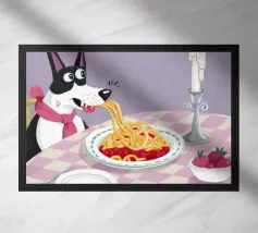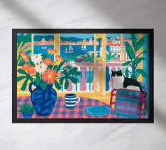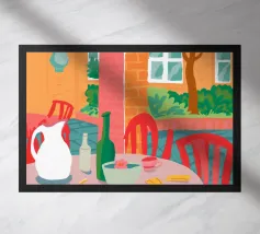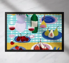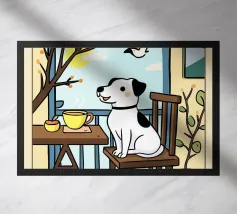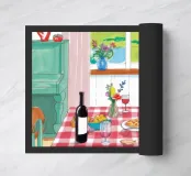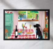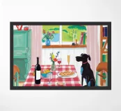Un'affascinante illustrazione di un cane nero seduto a una tavola a scacchi imbandita di vino, che guarda un giardino soleggiato da una cucina colorata.