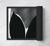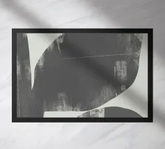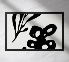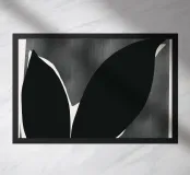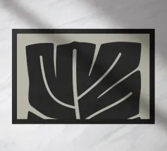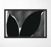 Un'audace silhouette nera di una pianta con due foglie si staglia su uno sfondo grigio strutturato. I colori contrastanti conferiscono un aspetto minimalista e moderno.