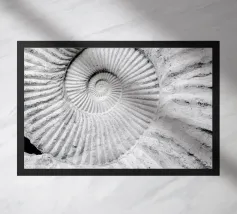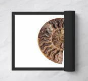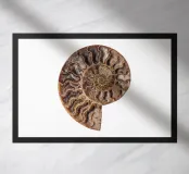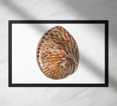 Conchiglia fossile pietrificata di amonite Questa fotografia cattura la conchiglia dell'ammonite in tutto il suo splendore, mettendone in risalto la splendida texture e gli intricati dettagli. L'ipnotico motivo a spirale racconta una storia di milioni di anni, trasportando gli spettatori in un'epoca in cui queste affascinanti creature vagavano per gli oceani. Le ricche tonalità della conchiglia fossile, che vanno dai marroni terrosi ai creme tenui e ai verdi tenui, creano un'atmosfera calda e invitante, rendendo questa immagine un punto focale perfetto in qualsiasi stanza.