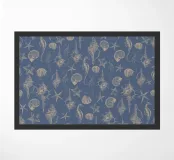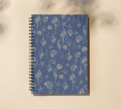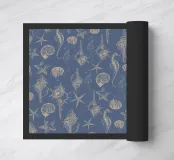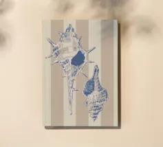 Conchiglie marine blu e beige su sfondo ecru. Disegno di crostacei.