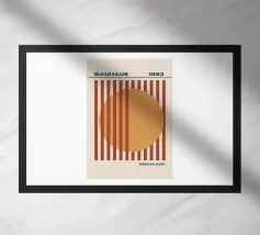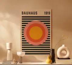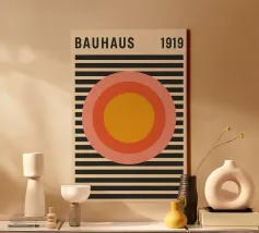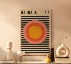Questo iconico poster combina tutto ciò che ha reso il Bauhaus così rivoluzionario: contrasto, chiarezza e geometria. L'anello dai colori vivaci che sovrasta le linee ritmiche simboleggia i nuovi inizi, l'ordine e la forza creativa, nello spirito del 1919. Una dichiarazione moderna per gli amanti del design e degli ambienti eleganti.