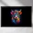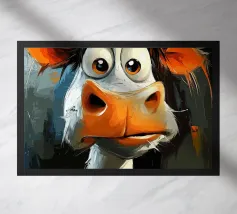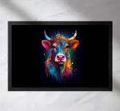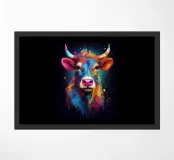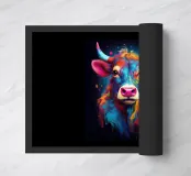 Un'impressionante pittura digitale di una mucca caratterizzata da colori vivaci e audaci che si fondono perfettamente con un effetto di schizzi di vernice. La resa artistica combina realismo e astrazione, creando una composizione surreale e accattivante su uno sfondo scuro.