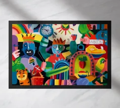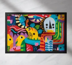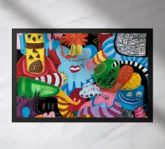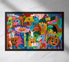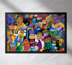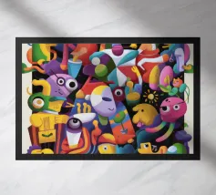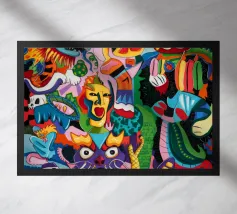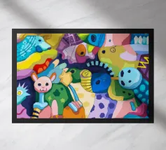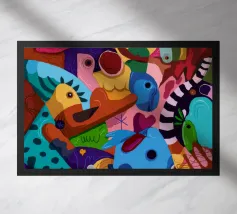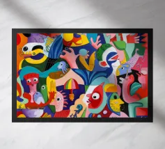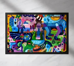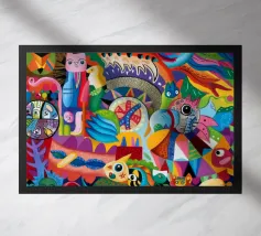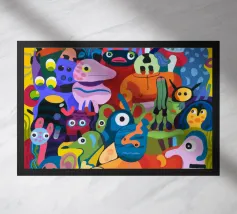 Esseri fantasiosi ed elementi fantastici si uniscono in una composizione vibrante. Questo dipinto invita gli spettatori a esplorare un mondo magico dove la creatività non conosce limiti.