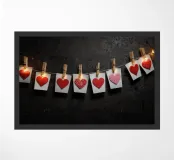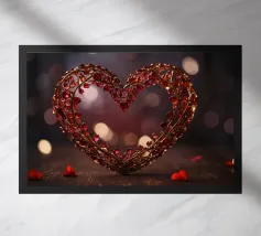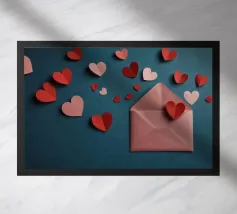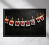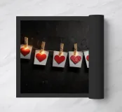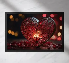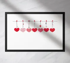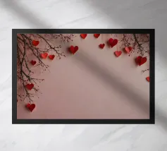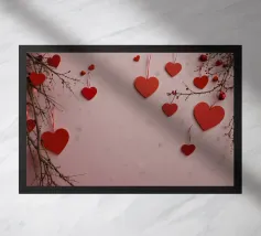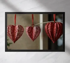 Un filo ornato da ritagli a forma di cuore in varie tonalità di rosso è appeso su uno sfondo scuro. Morbide luci calde illuminano i cuori, creando un'atmosfera romantica per San Valentino.